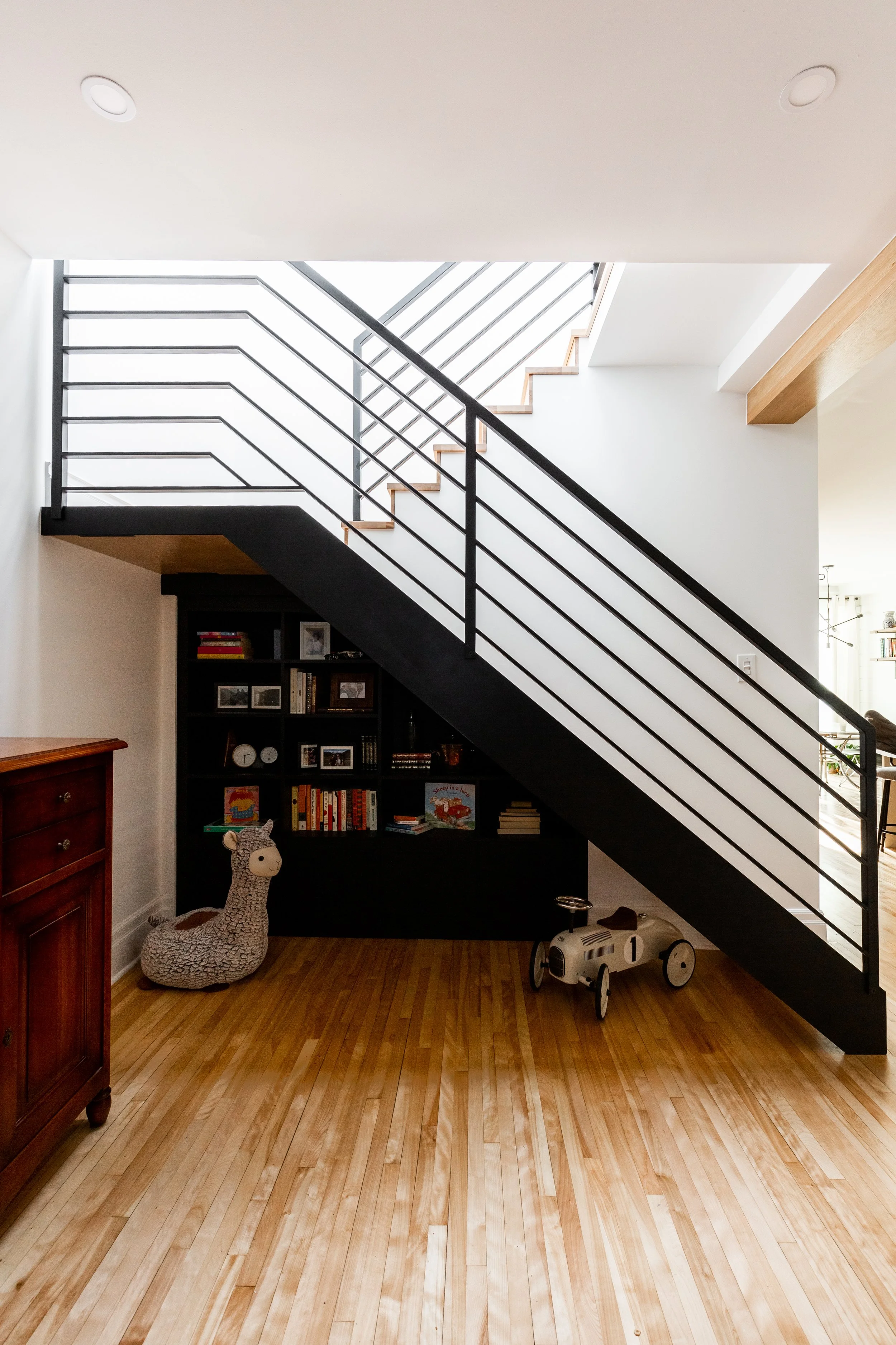 Adulthood est un projet d’agrandissement par l’intérieur d’un duplex montréalais. Les propriétaires, Kristen et Louis-Paul, habitaient le rez-de-chaussée depuis quelques années et avaient déjà investi pour rénover leur cuisine et leur salle de bain. Ils désiraient maintenant se créer un coin bien à eux.