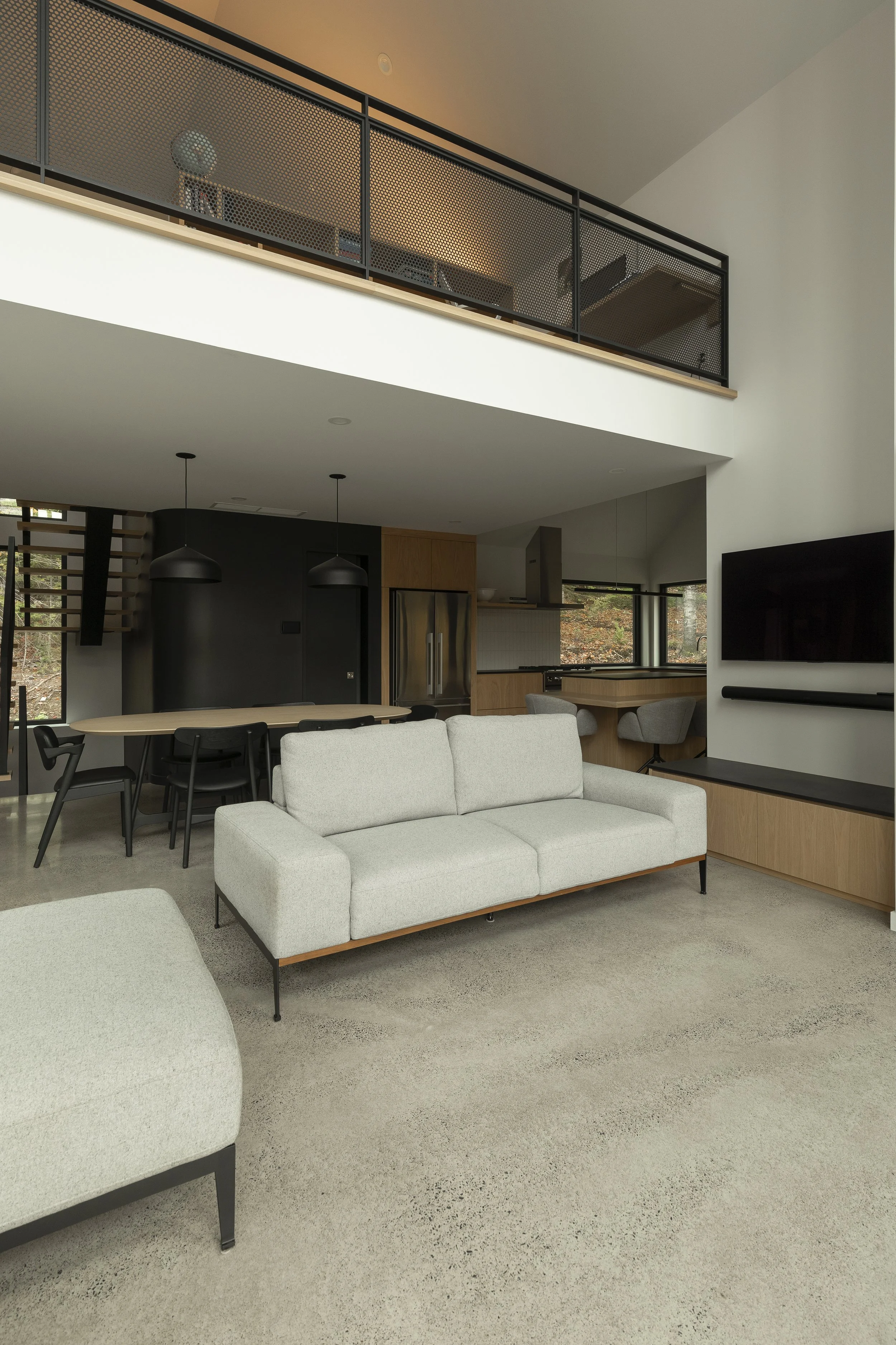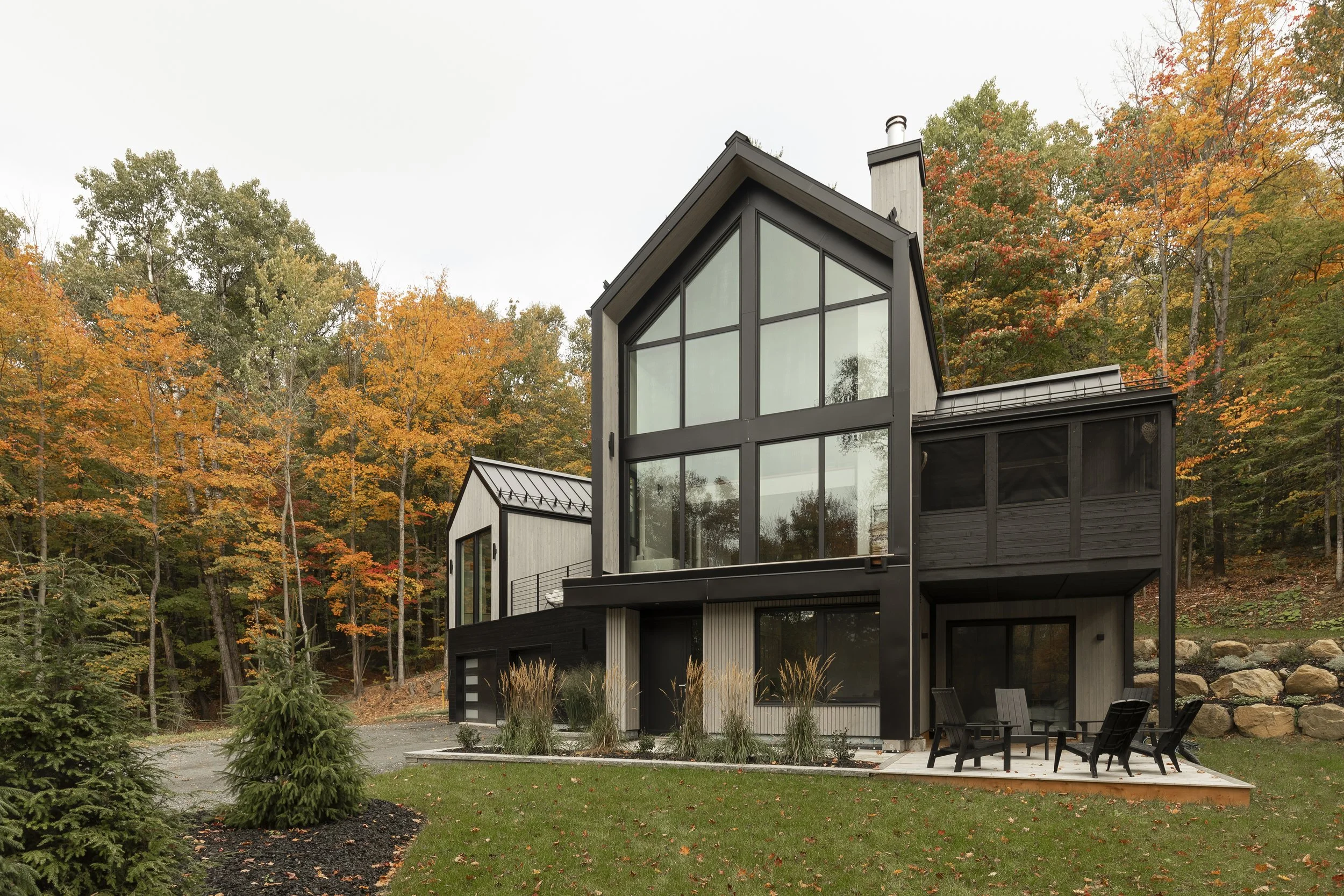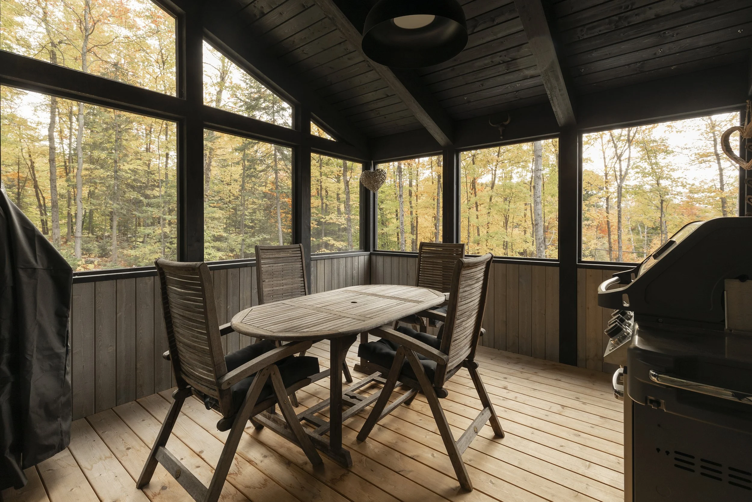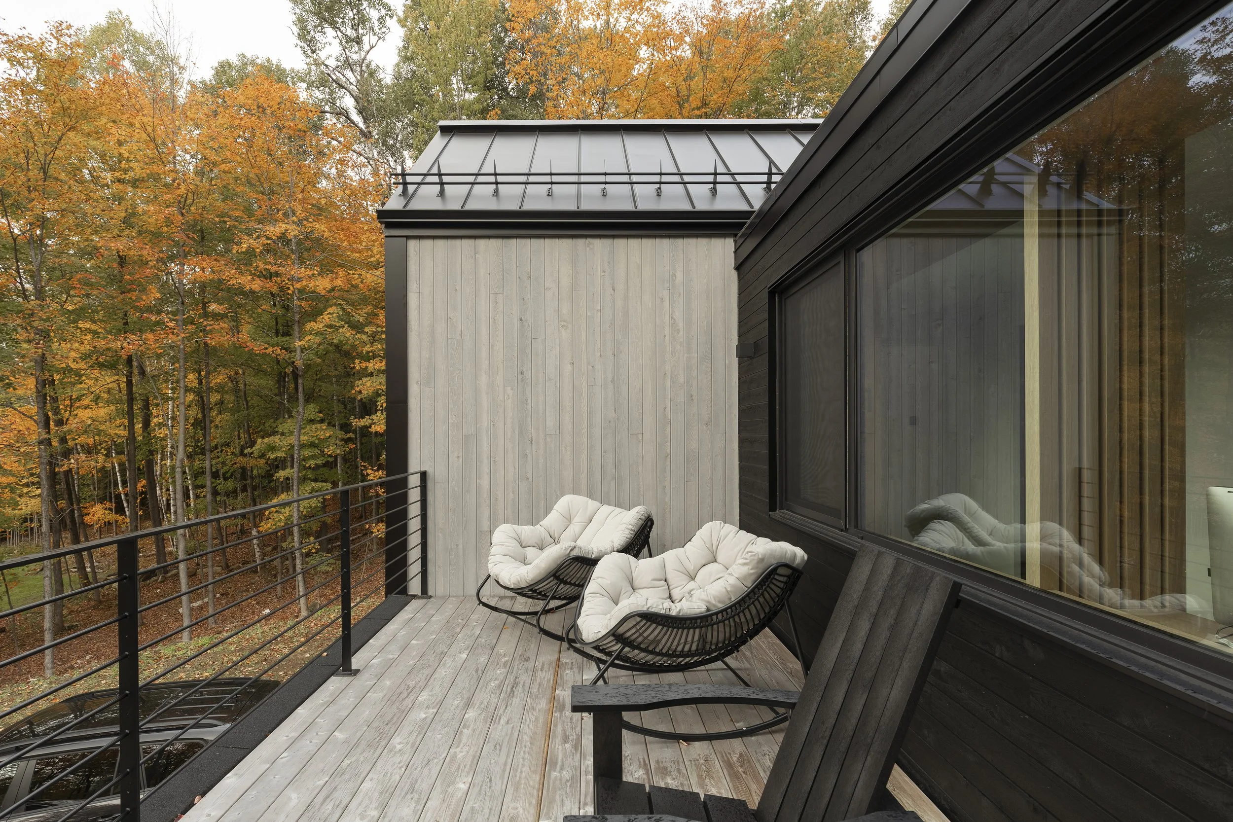 Le clou du spectacle demeure la terrasse située entre les deux volumes. Sa disposition offre une vue imprenable permettant d’admirer le lac Millette ainsi que le coucher du soleil. Angulaire et enveloppant, le balcon a l’effet d’un câlin sur la maison.