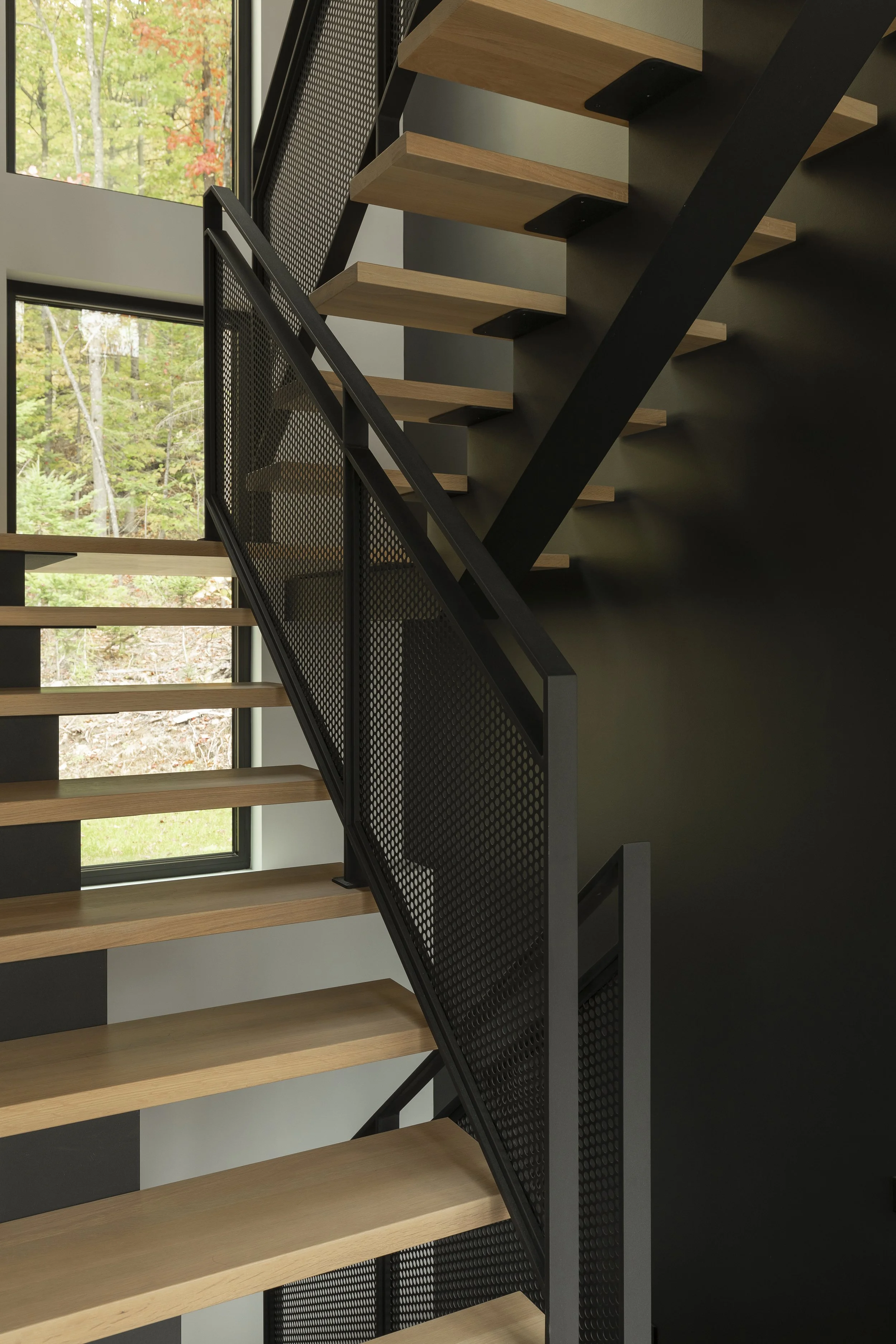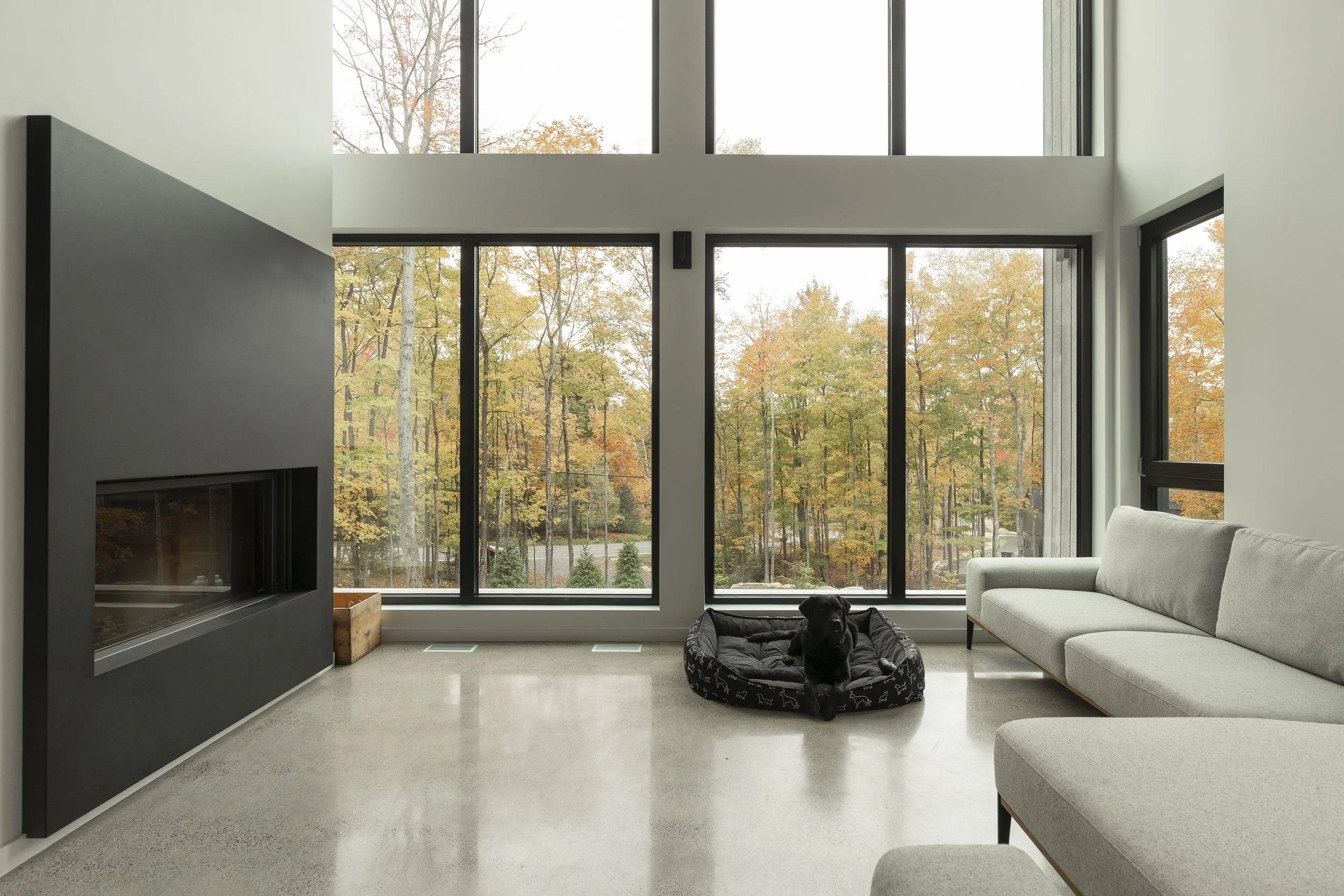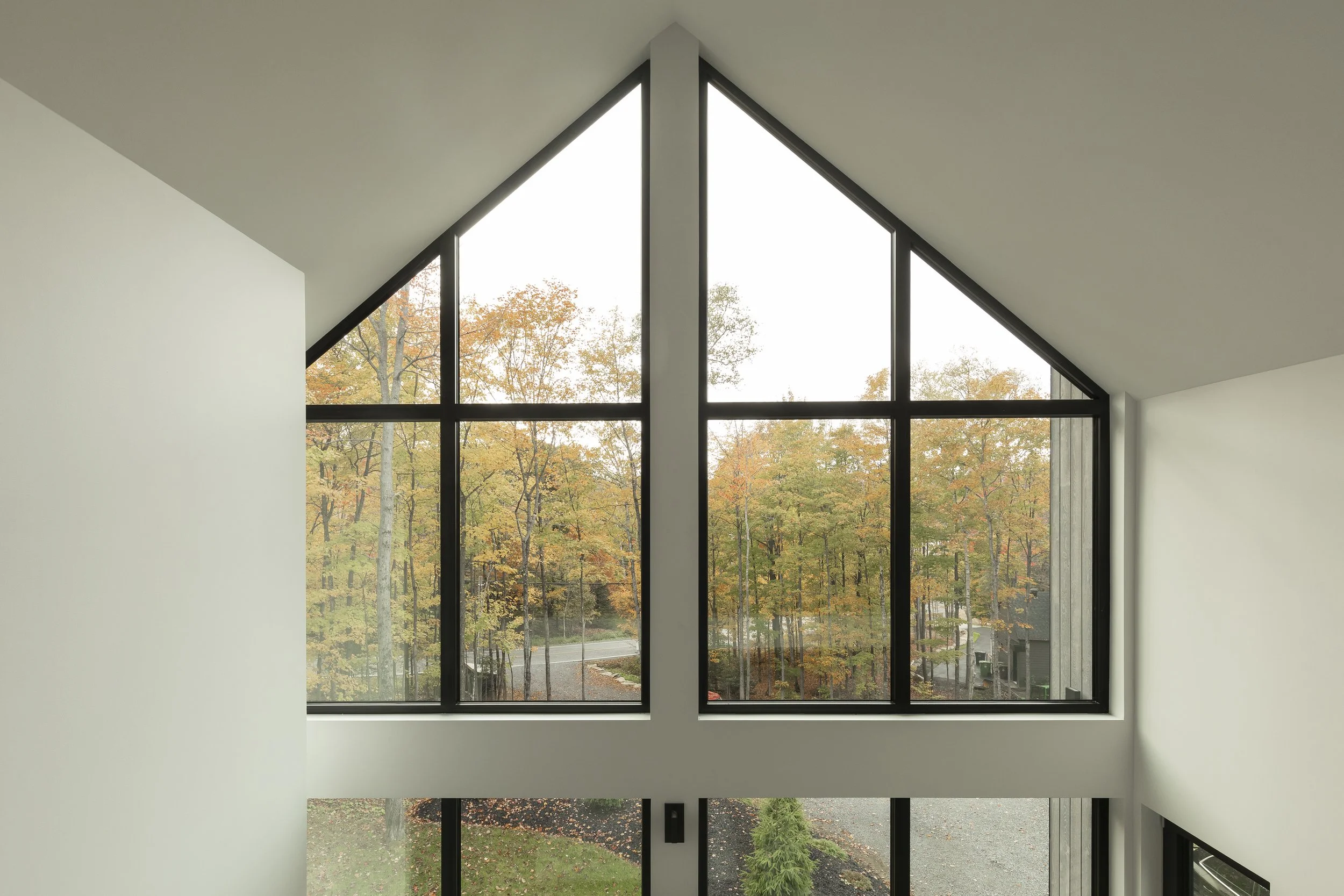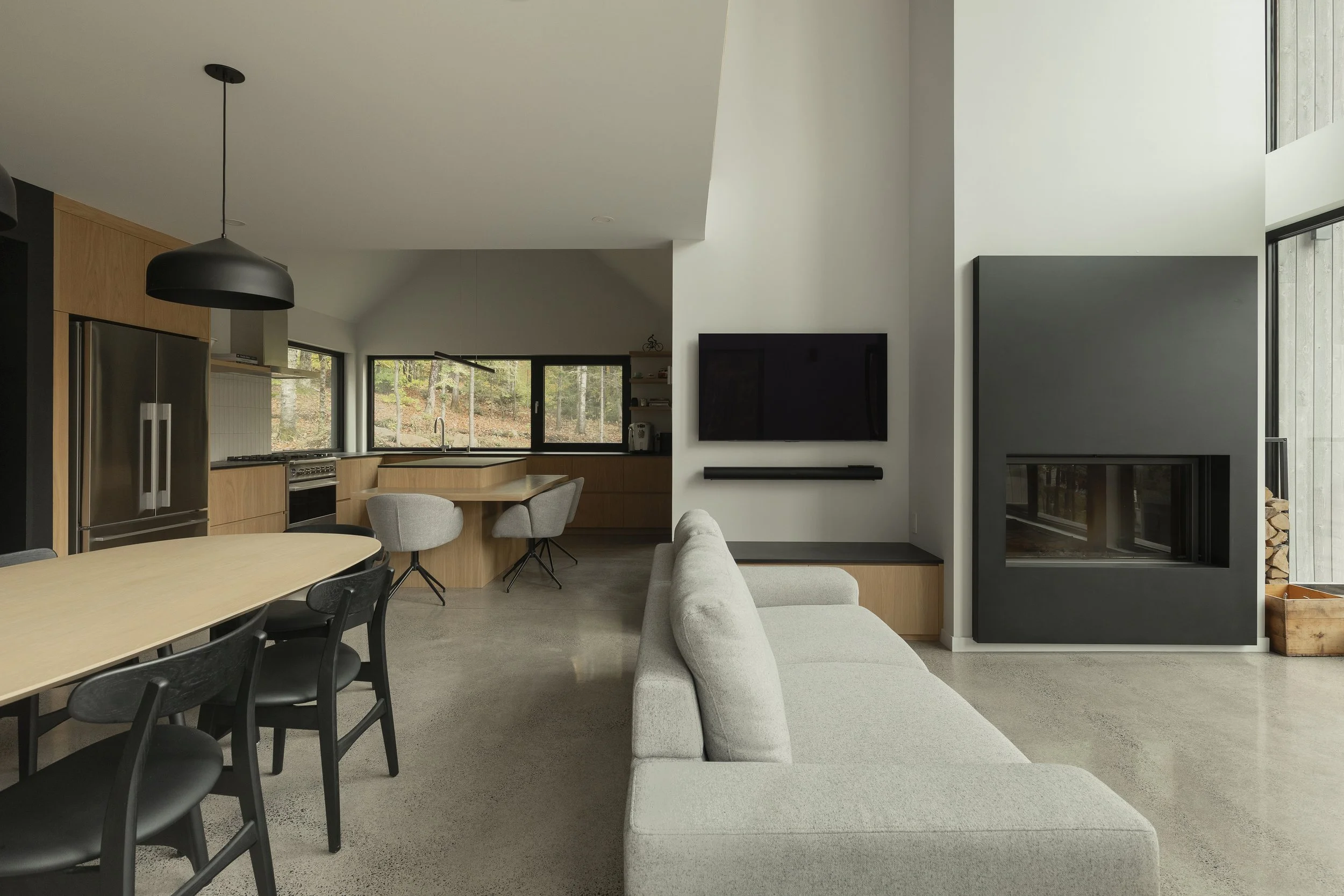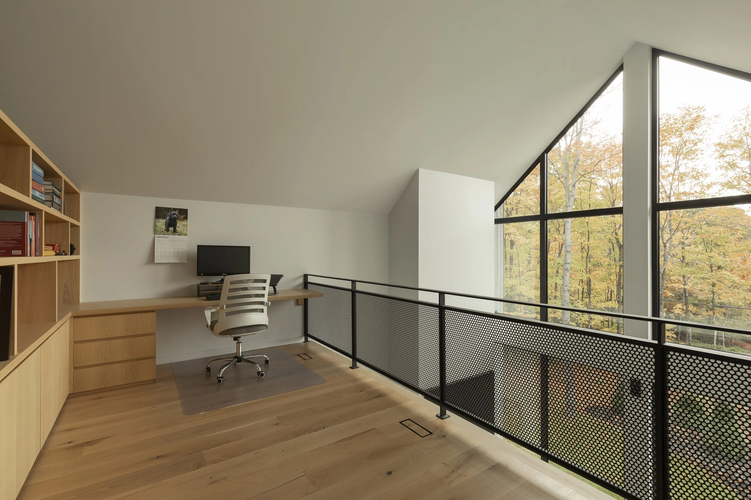 Le clou du spectacle demeure la terrasse située entre les deux volumes. Sa disposition offre une vue imprenable permettant d’admirer le lac Millette ainsi que le coucher du soleil. Angulaire et enveloppant, le balcon a l’effet d’un câlin sur la maison.