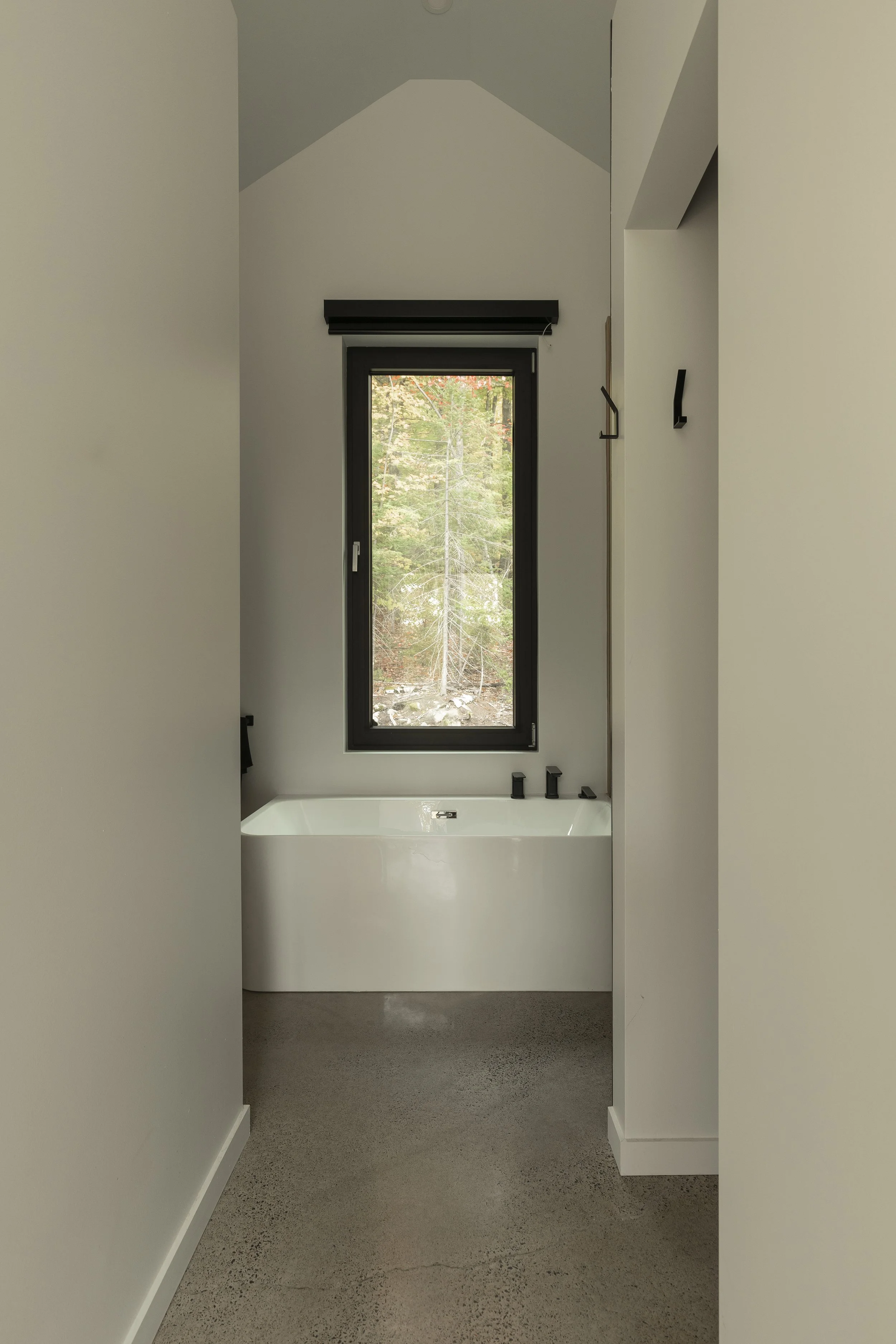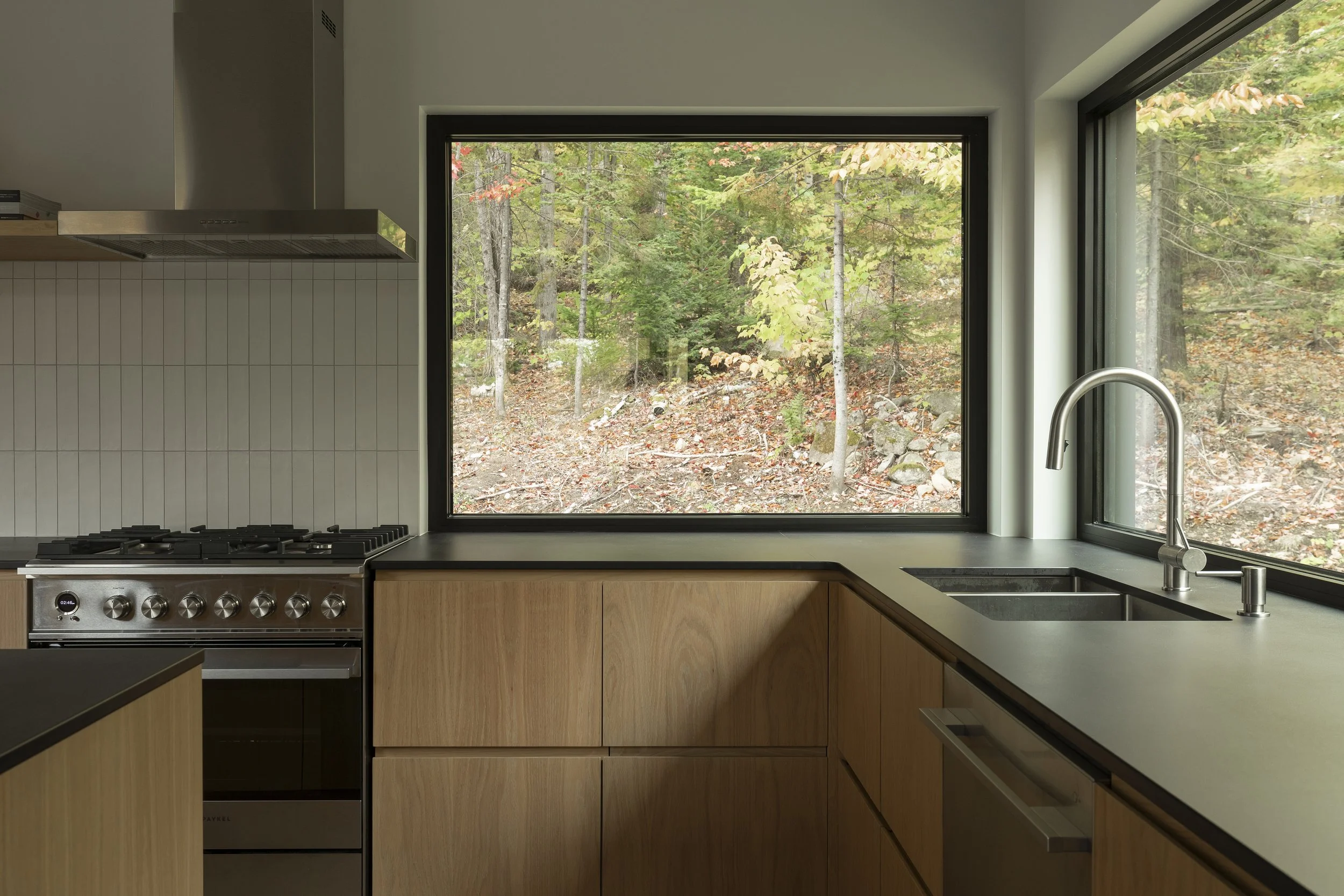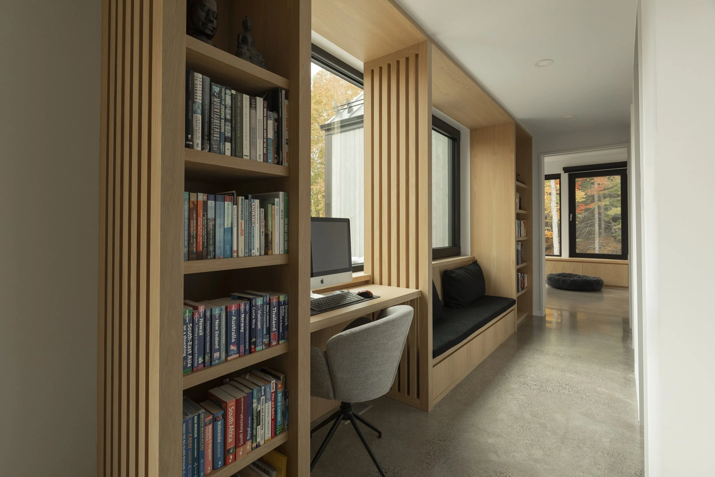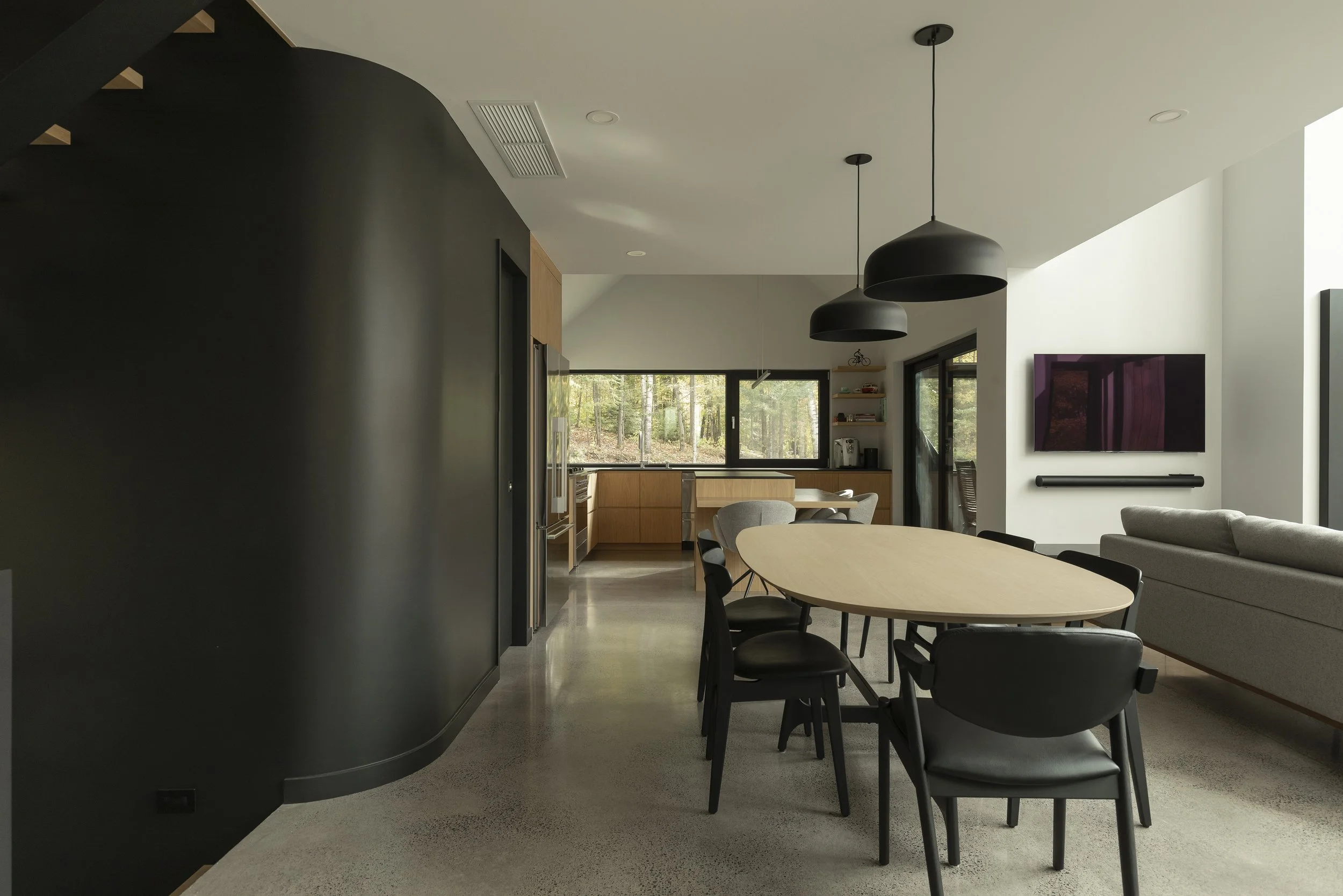 Le clou du spectacle demeure la terrasse située entre les deux volumes. Sa disposition offre une vue imprenable permettant d’admirer le lac Millette ainsi que le coucher du soleil. Angulaire et enveloppant, le balcon a l’effet d’un câlin sur la maison.