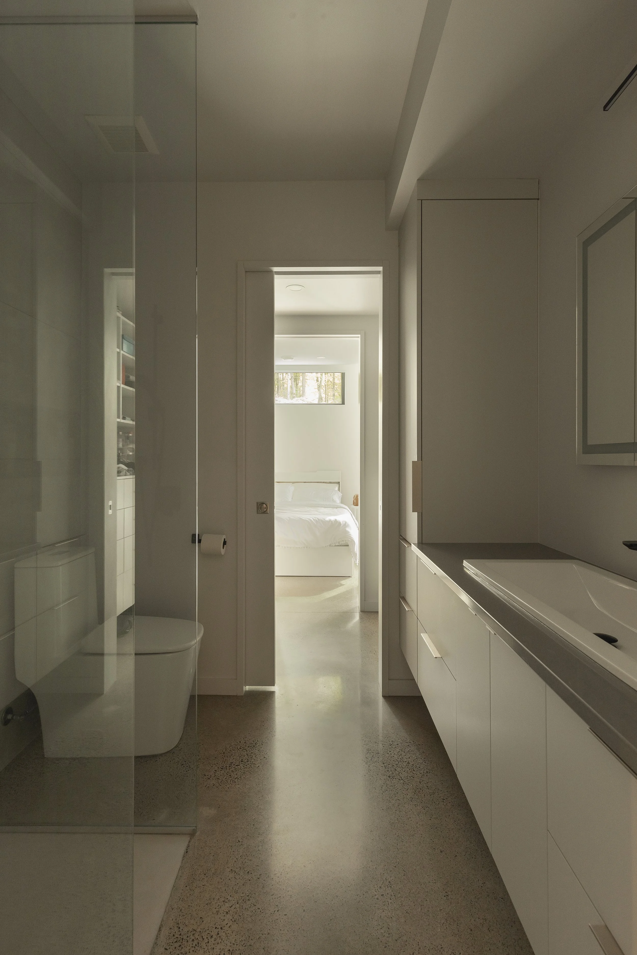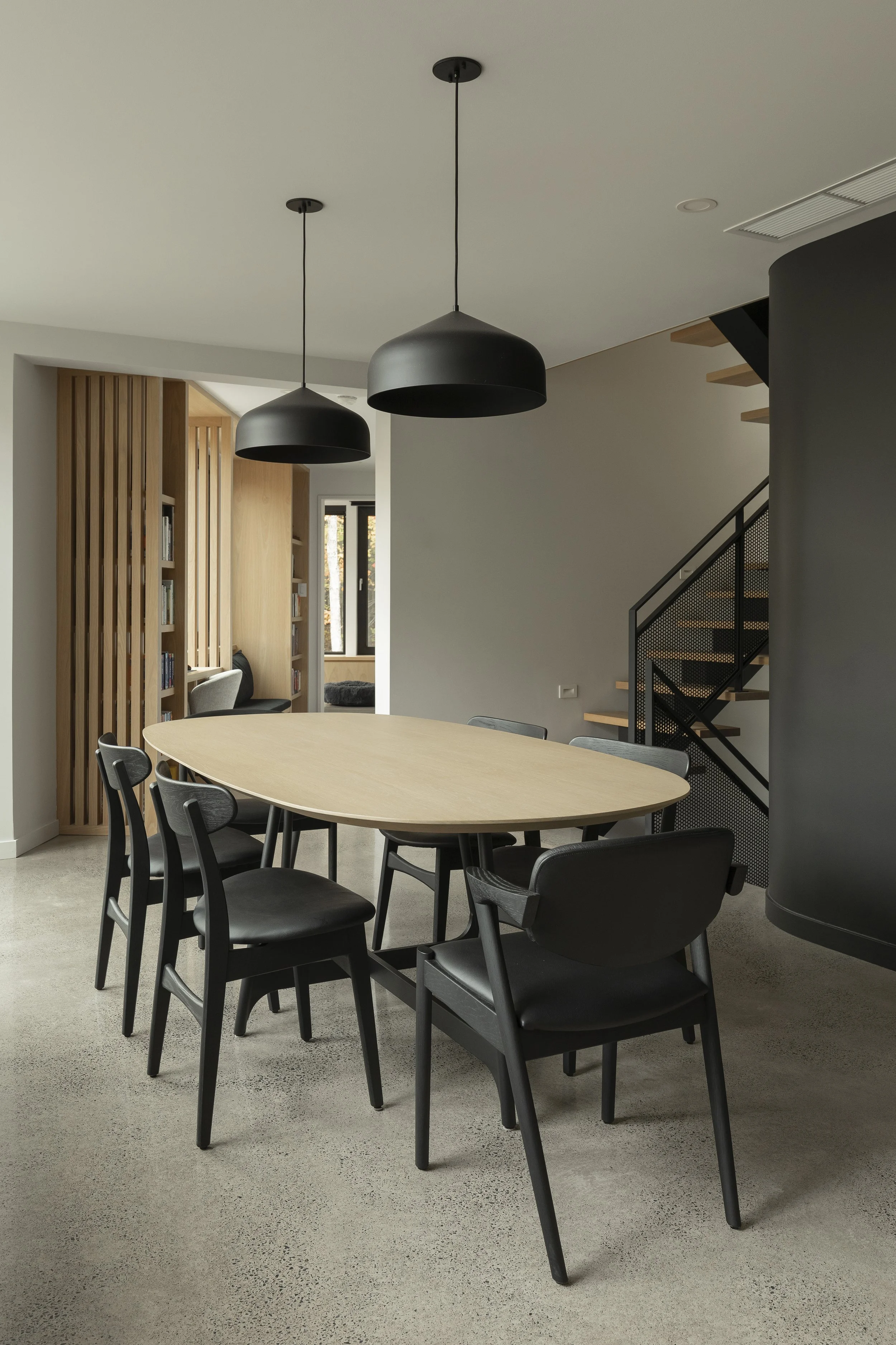 Cette maison, c’est le style scandinave à l’ère moderne: deux ailes avec de jolis toits en pignon, deux aires de vie reliées par un trait d’union. D’un côté, les espaces communs, des bureaux de travail pour Anik et Mark et de l’intimité pour Silke; de l’autre, une suite parentale sur mesure pour les principaux intéressés, avec une vue sur la forêt qui invite à se poser.